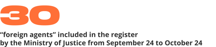 This month (from September 24 till October 24) the Ministry of Justice recognized 30 individuals and organizations as «foreign agents». A total of 129 individuals and organizations have been assigned «foreign agent» status since the beginning of the war.