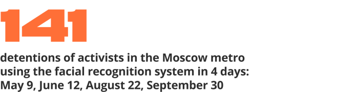 For detentions during holidays and days of mass rallies, the police use a facial recognition system. Mass «preventive» detentions of activists in the Moscow metro occurred during many public holidays in the past 6 months. We noted detentions on Victory Day, May 9, Russia Day, June 12, Flag Day, August 22. In these three public holidays, as well as on September 30, when the documents for annexation of the so-called DPR, LPR, and the occupied parts of the Zaporizhzhia Oblast and Kherson Oblast were signed in the Kremlin, we have registered 141 detentions of this type. More information in our report.